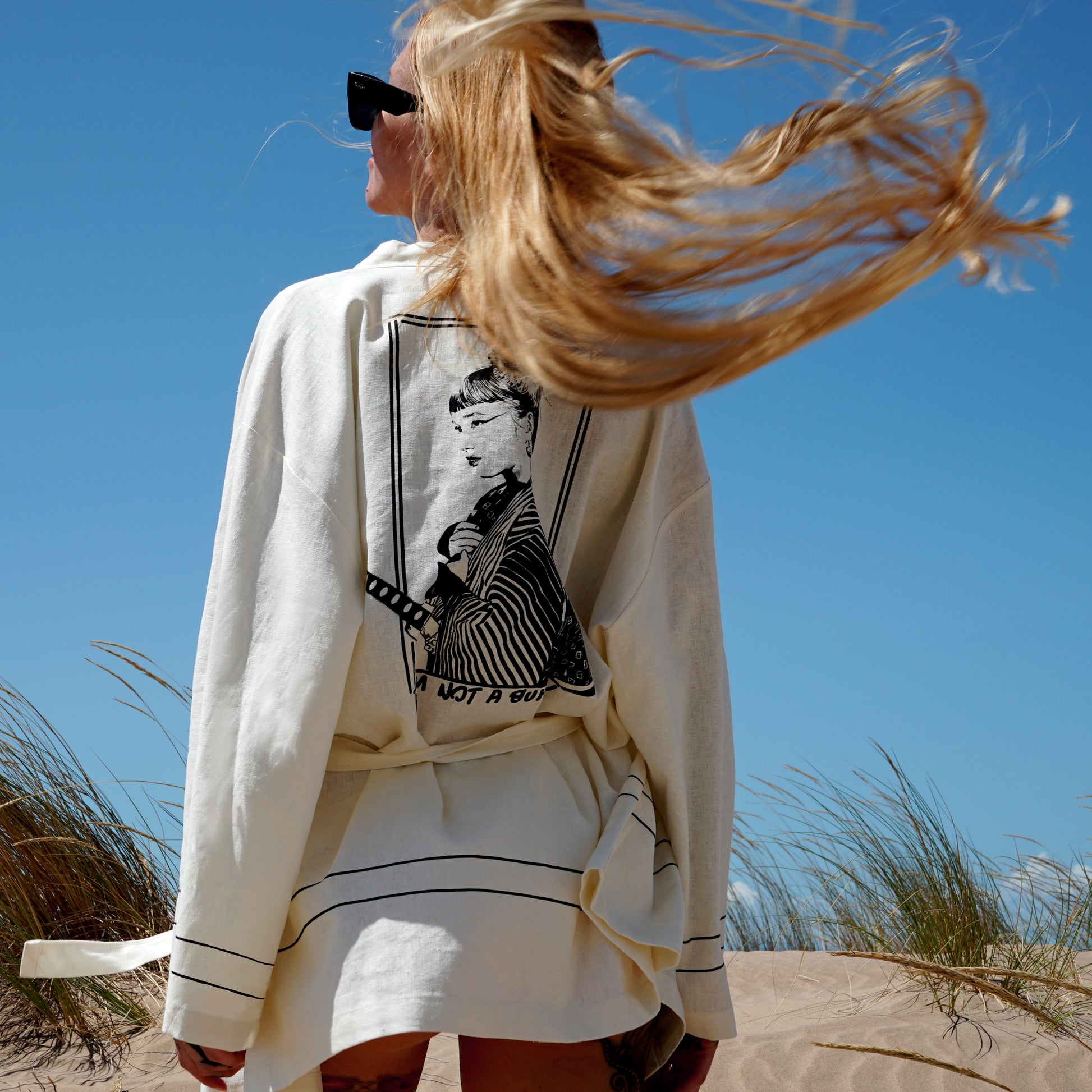 Bu kimono sanatçı Pelin Aysan’ın "I Am Not a Quitter" serisinin sınırlı sayıdaki parçalarından biridir. Üzerindeki çizim kendi çizimi ve özeldir.